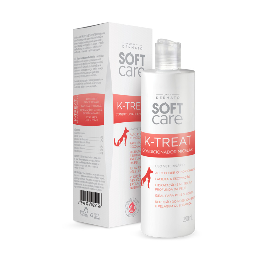 Banhar o animal com K-Treat Shampoo Micelar, ou outro shampoo dermocosmético Soft Care, e enxaguar. Aplicar o K-Treat Condicionador Micelar, deixar agir por 5 minutos e enxaguar bem.
