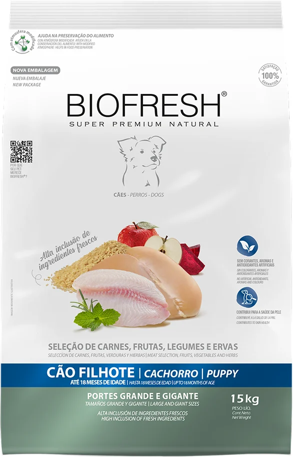 Ração Biofresh Mix de Carne, Frutas, Legumes e Ervas Frescas Cães Filhotes de Raças Grandes e Gigantes é um alimento super premium incluindo alimentos selecionados e frescos. Oferece uma boa qualidade a saúde intestinal e oral repondo os nutrientes diários.