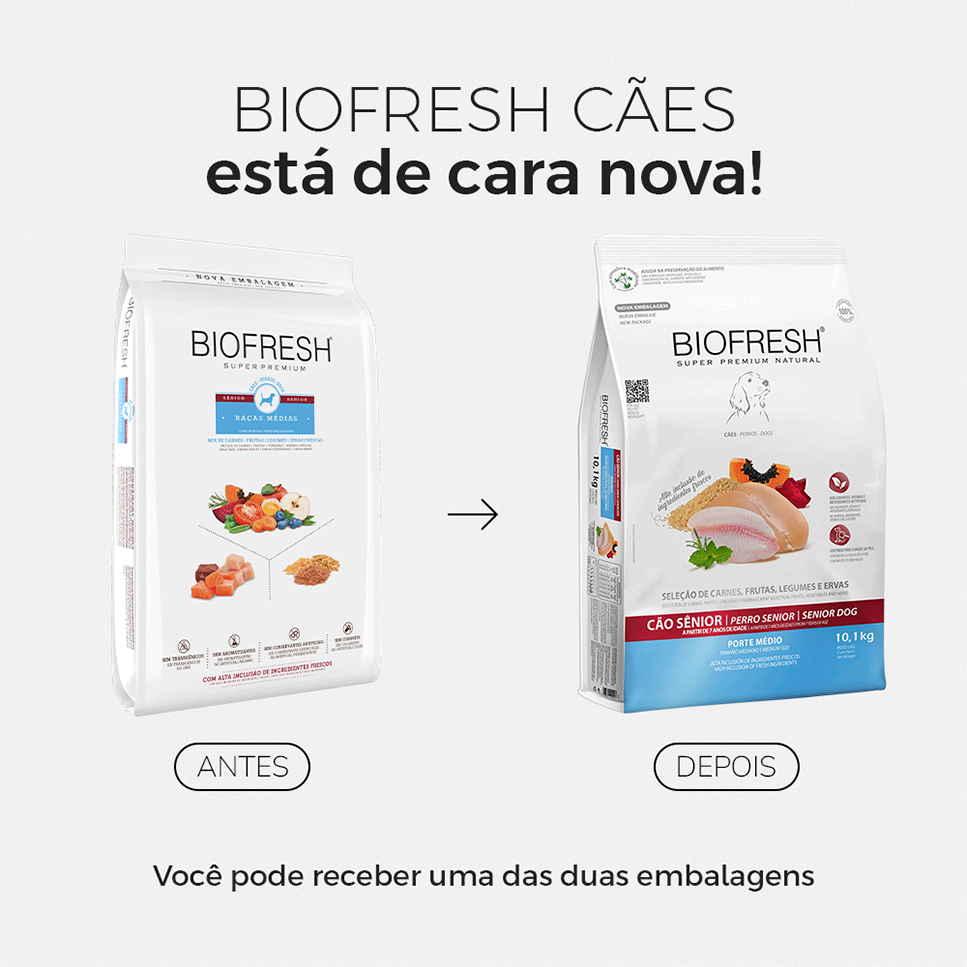 Ração Biofresh Mix de Carne, Frutas, Legumes e Ervas Frescas Cães Sênior de Raças Médias é ideal por elevar a nutrição para seu pet que está na faixa etária sênior. Ajudando a preservar qualidades como: musculatura forte, desenvolvimento mental e saúde do sistema digestivo, renal e cardíaco. Não contém transgênicos, conservantes, corantes e nem aromatizantes artificiais. Além disso, também ajuda a preservar a capacidade cognitiva do seu amiguinho.