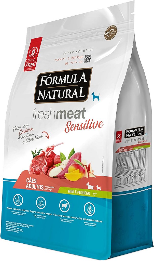 Ração Fórmula Natural Fresh Meat Sensitive Cães Adultos Portes Mini e Pequeno tem como grande diferencial a utilização de diferentes cortes de carne, uma variedade de frutas e vegetais e sem a utilização de grãos - “grain free”. Além disso, sua receita fornece nutrientes que atendem as necessidades de forma equilibrada, dos cães adultos de porte mini e pequeno.