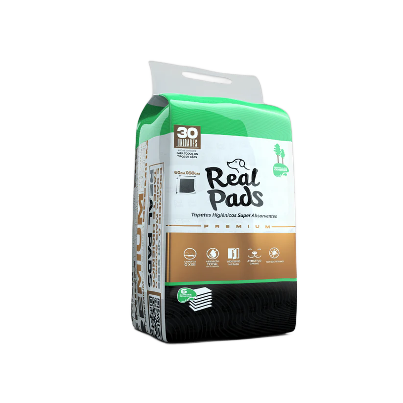 O Tapete Higiênico Real Pads com 30 unidades é ultra absorvente e camufla o xixi. Ele tem adesivo na base para não escorregar pelo chão. Além disso, são feitos a base de carvão de bambu que neutraliza os odores e contêm atrativo canino que estimula o seu cachorro a fazer xixi no lugar certo.